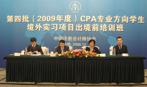 2008年12月11-13日,中注协在京举办“第四批(2009年度)CPA专业方向学生境外实习项目出境前培训班”。陈毓圭秘书长出席开班仪式并作讲话。他向入选境外实习项目的同学们表示祝贺,并寄语大家珍惜机会,学习知识,开阔视野,提高素质,早日成长为中国注册会计师行业的栋梁。王丽然顾问主持开班仪式。来自19所CPA专业方向院校的100多名学生参加了培训。